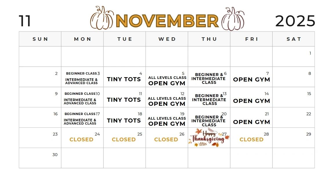 We are now able to share our gym calendar for the month of November. South Side Spirit will only be hosting private lessons during Thanksgiving break.